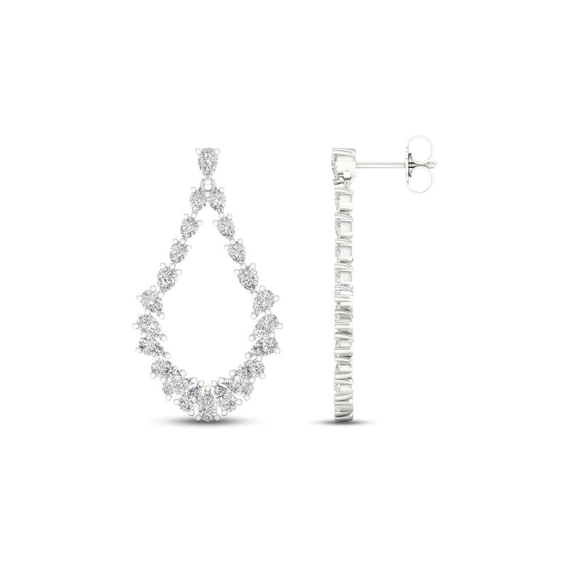 These luxuriant earrings feature dazzling pear-shaped diamonds forming a dangling teardrop design. Fashioned in iconic 14K white gold, the earrings have a total diamond weight of 2 1/2 carats and secure with friction backs.
